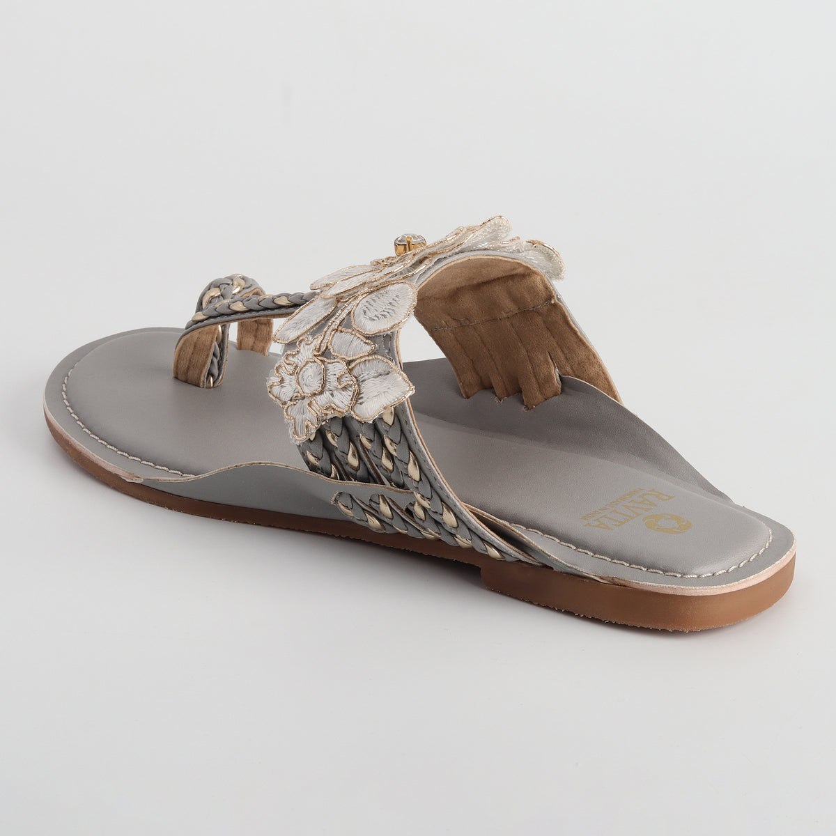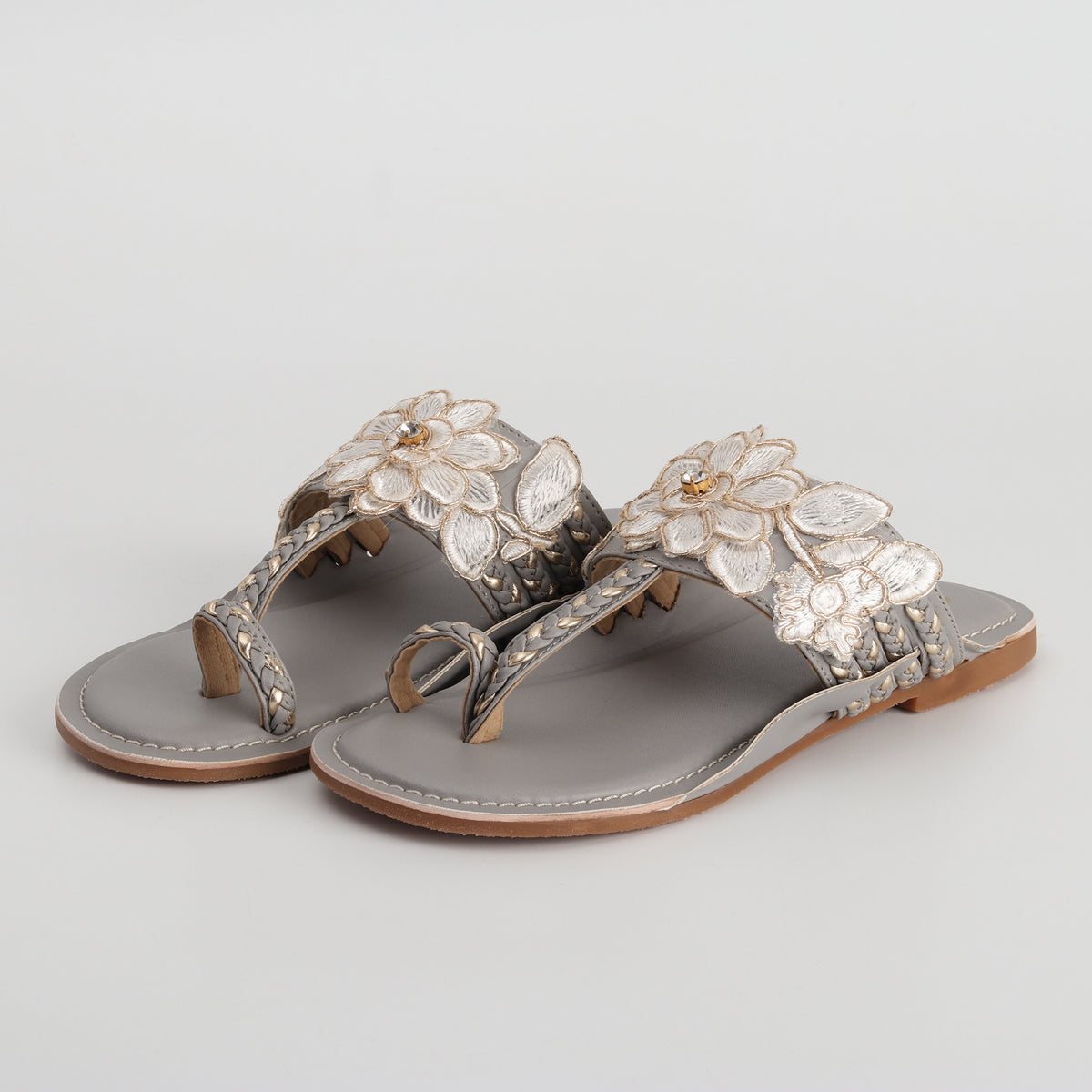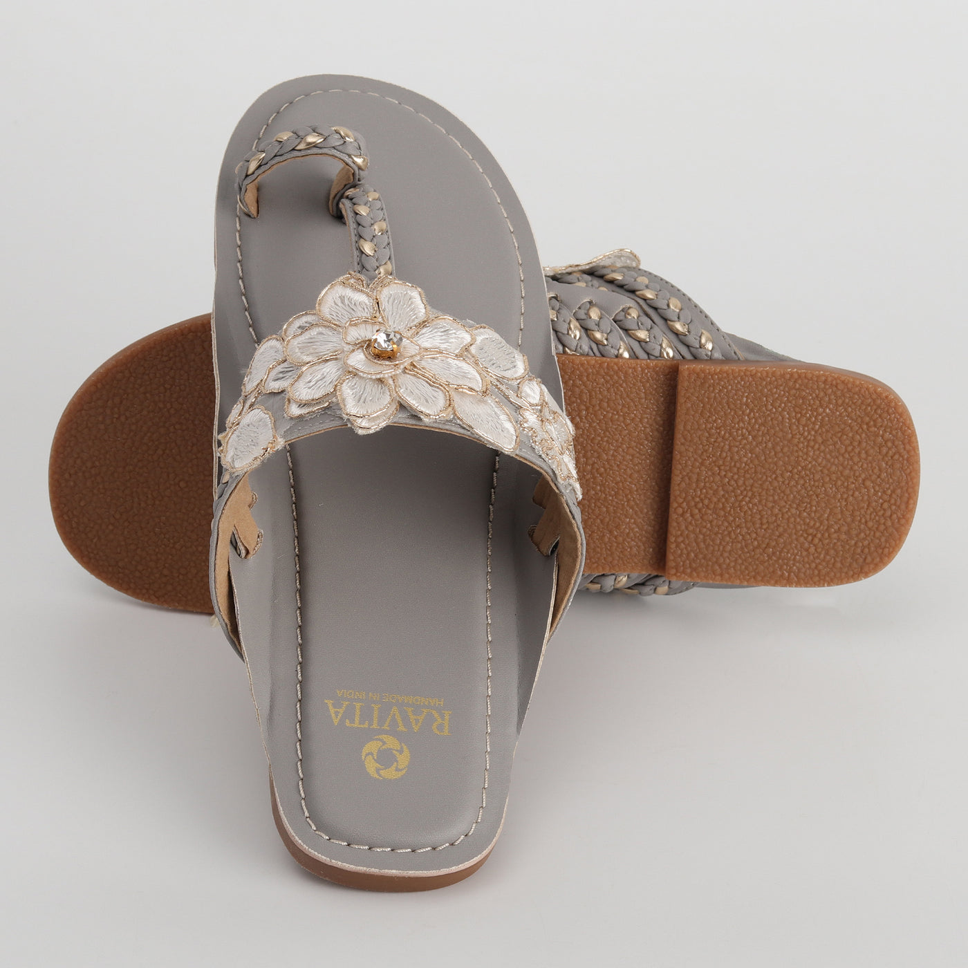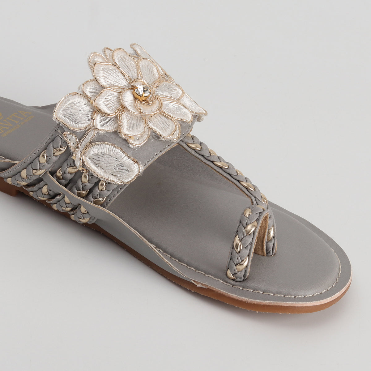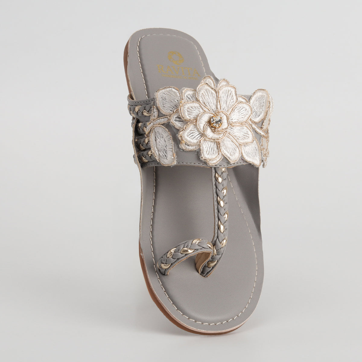 Women’s Grey Kolhapuri Chappal with 3D Flower Design - Festive & Party Wear Flats